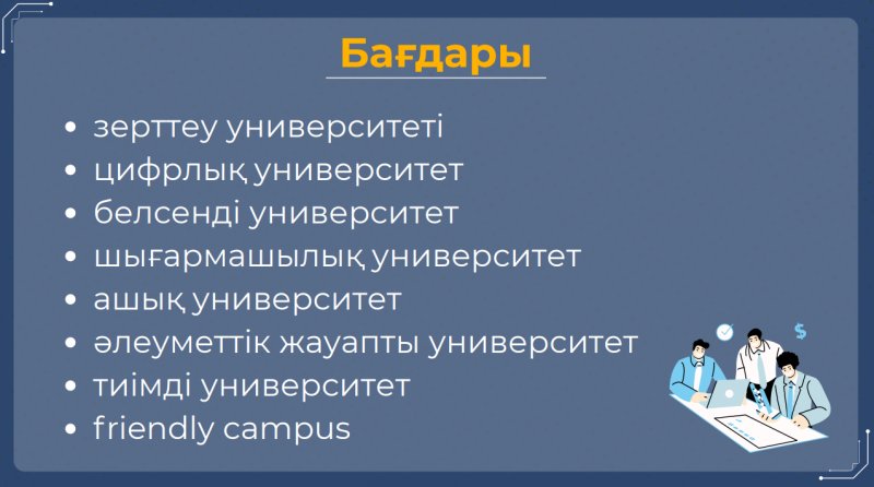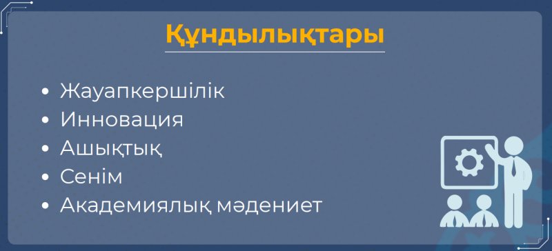 «Адами капиталды дамыту және цифрлық уақыттың көрнекті, әлеуметтік-жауапты мамандарын, үйлесімді және жан-жақты тұлғаларды қалыптастыруға жәрдемдесу».